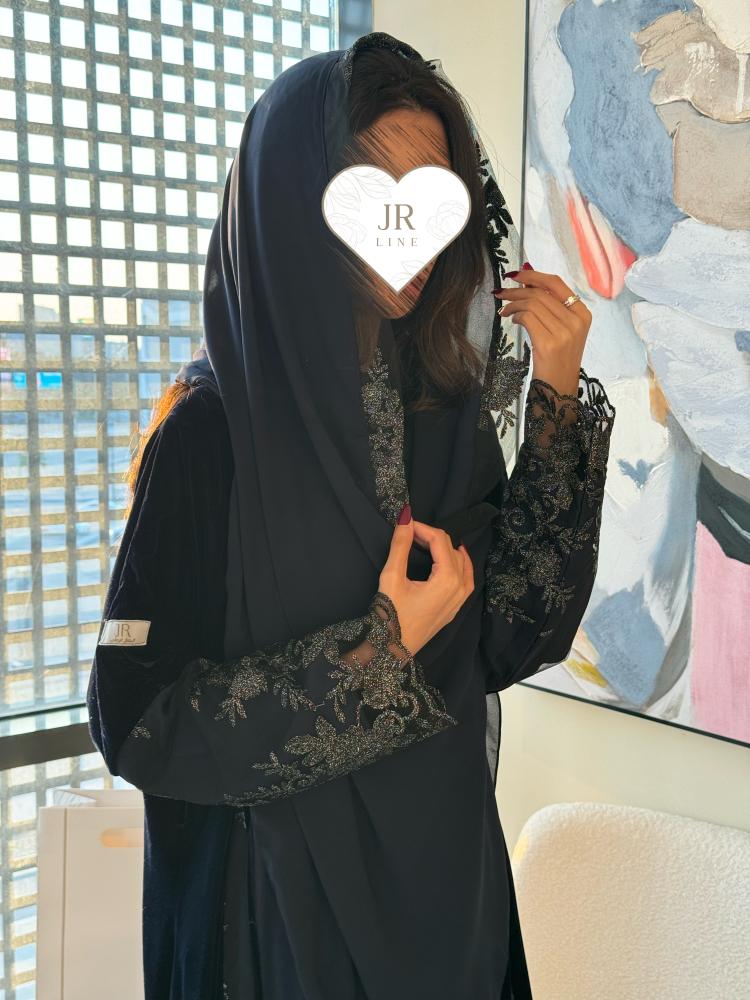 تشكيلة شتاء 2024 - عباية غادين بقماش مخمل دانتيل فضي - كحلي