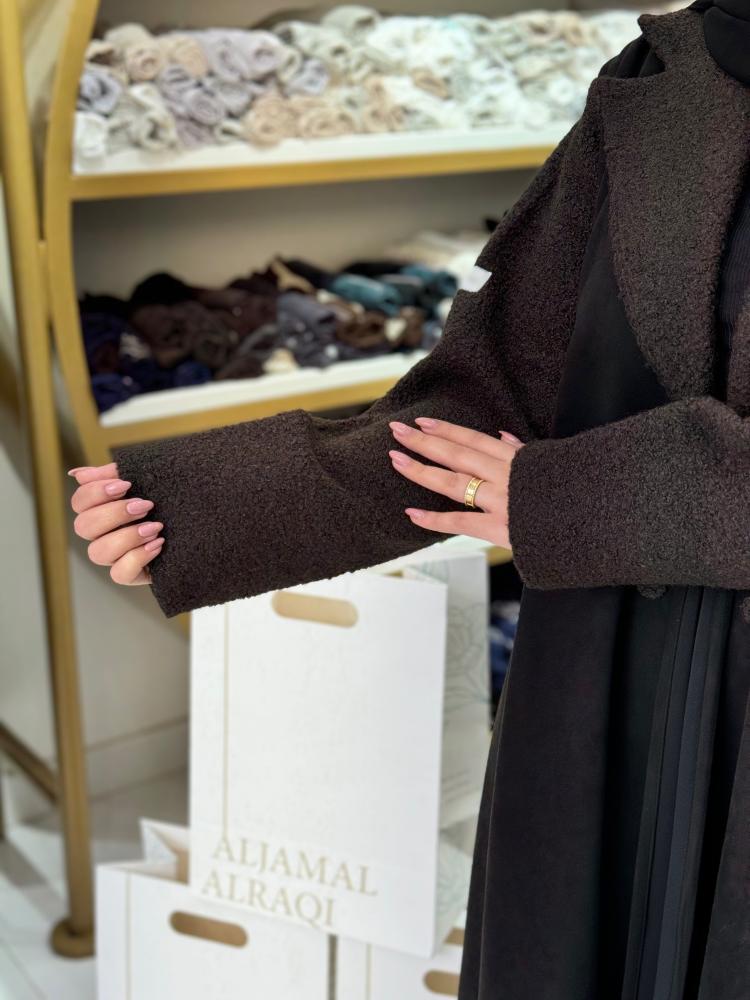 تشكيلة شتاء 2025 - عباية بريانا بقماش شامواه تدخيلات جوخ بني غامق