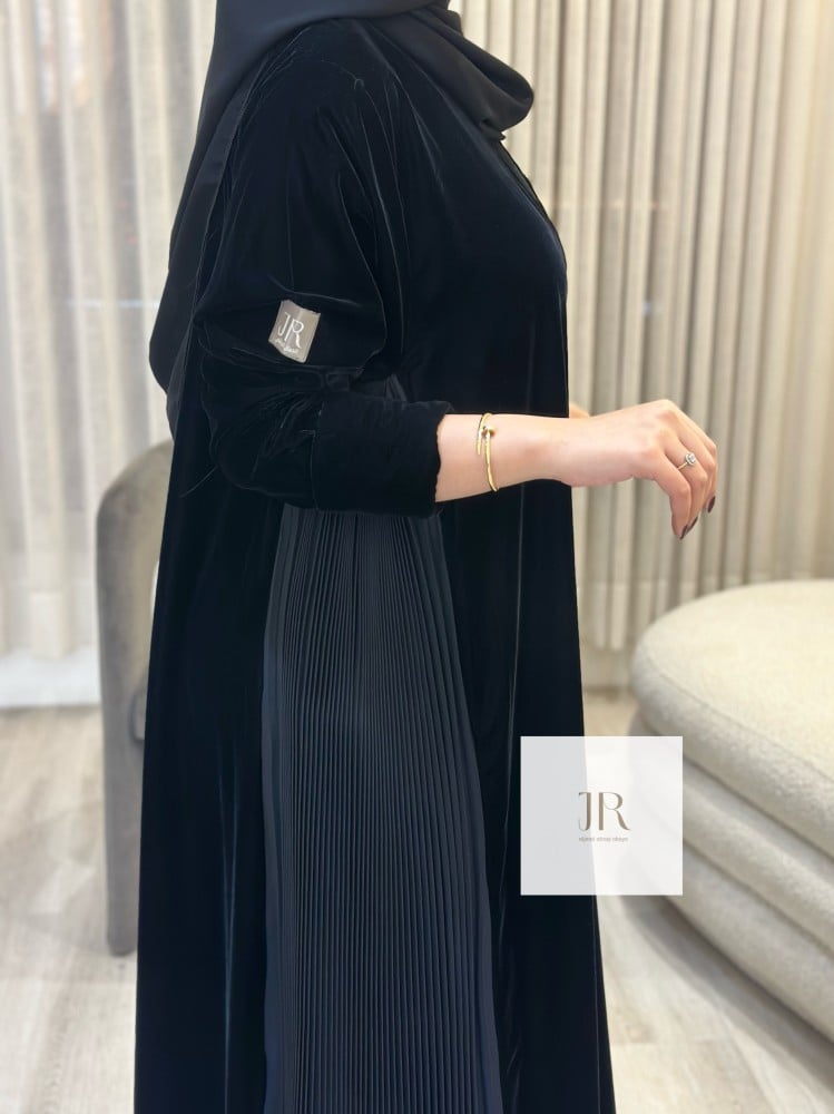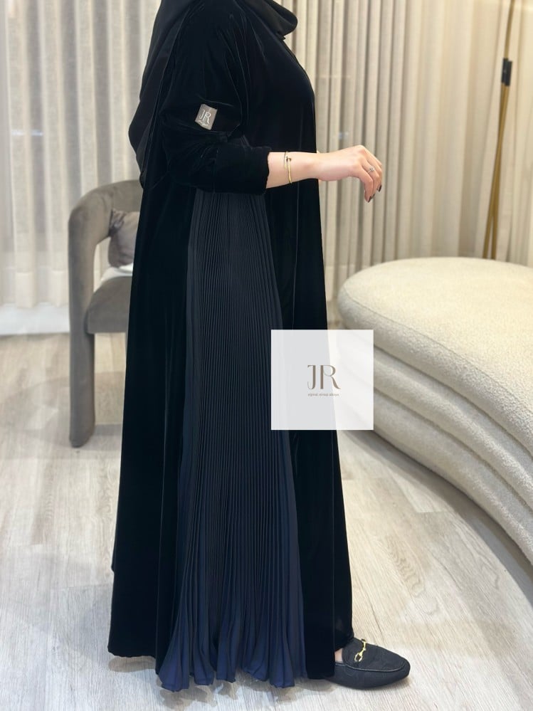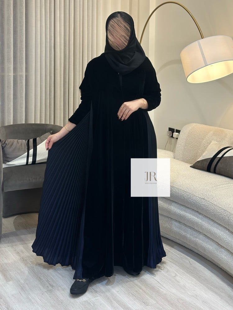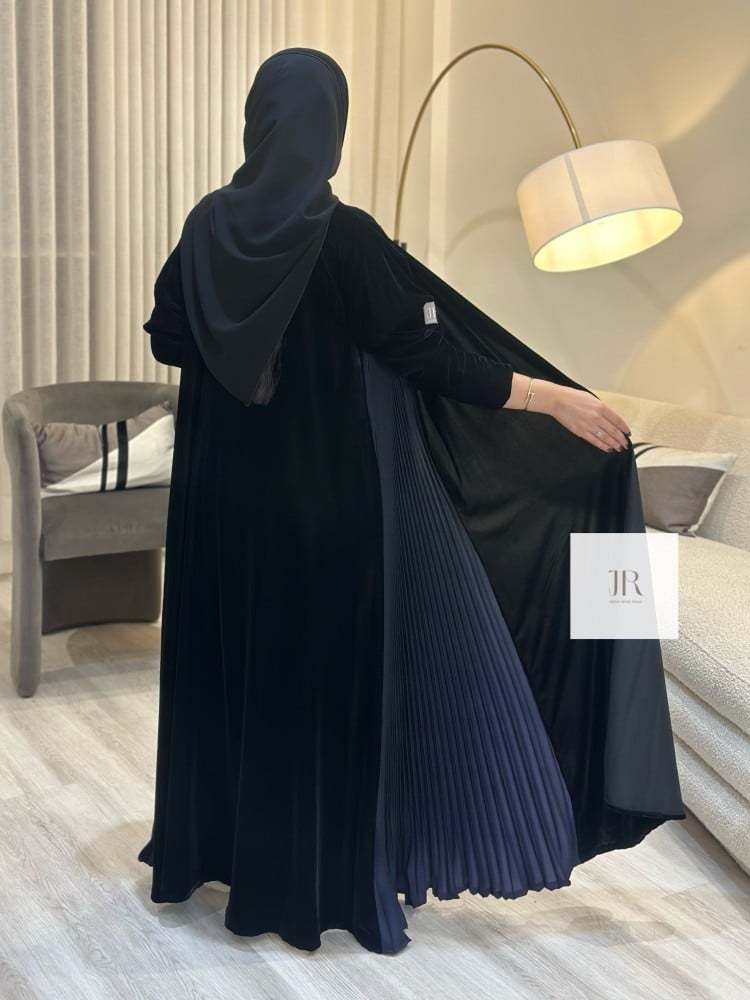 عباية الطاووس l مخمل اسود بكسرات جانبية كحلي