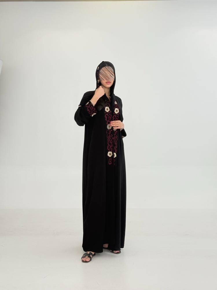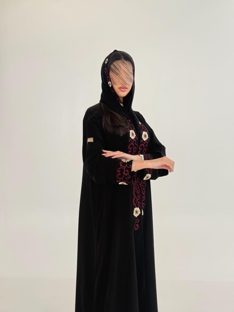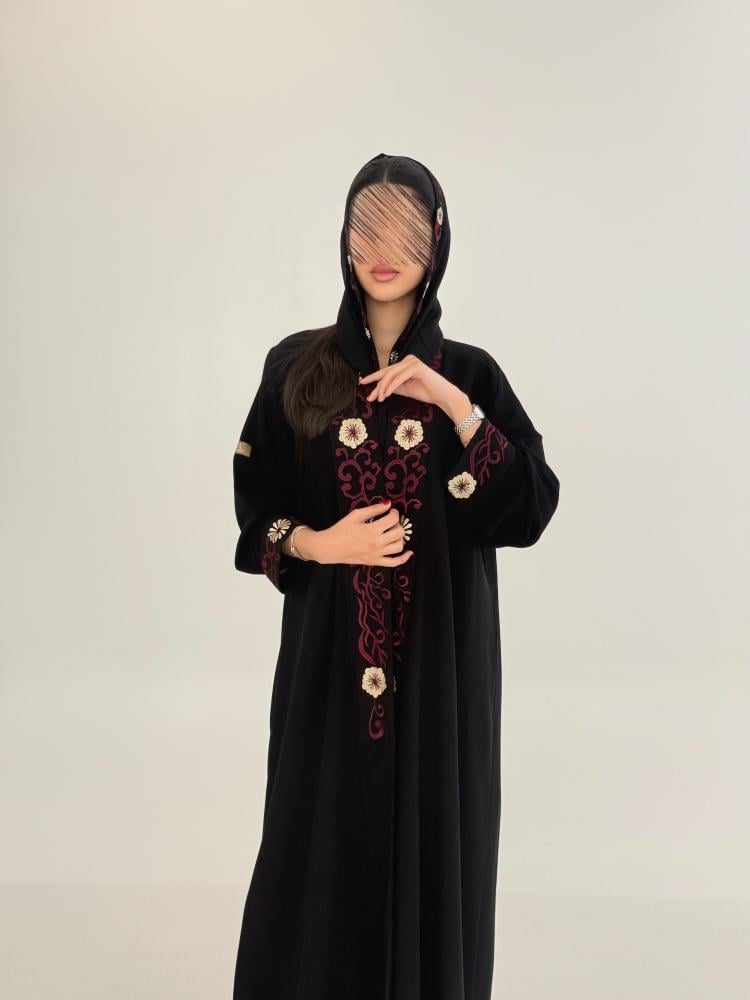 عباية خالده بقماش كريب ملكي مزين بتطريز عنابي