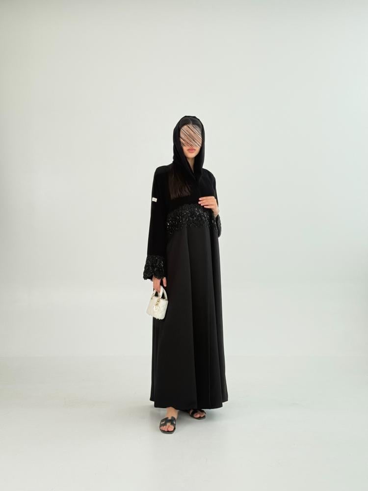 عباية راما بقماش كريب ملكي مع كريب الانافة بشك اسود
