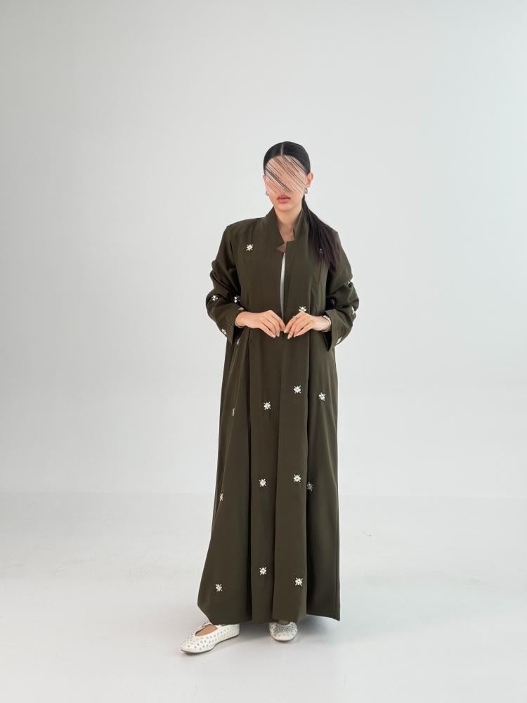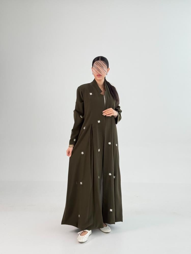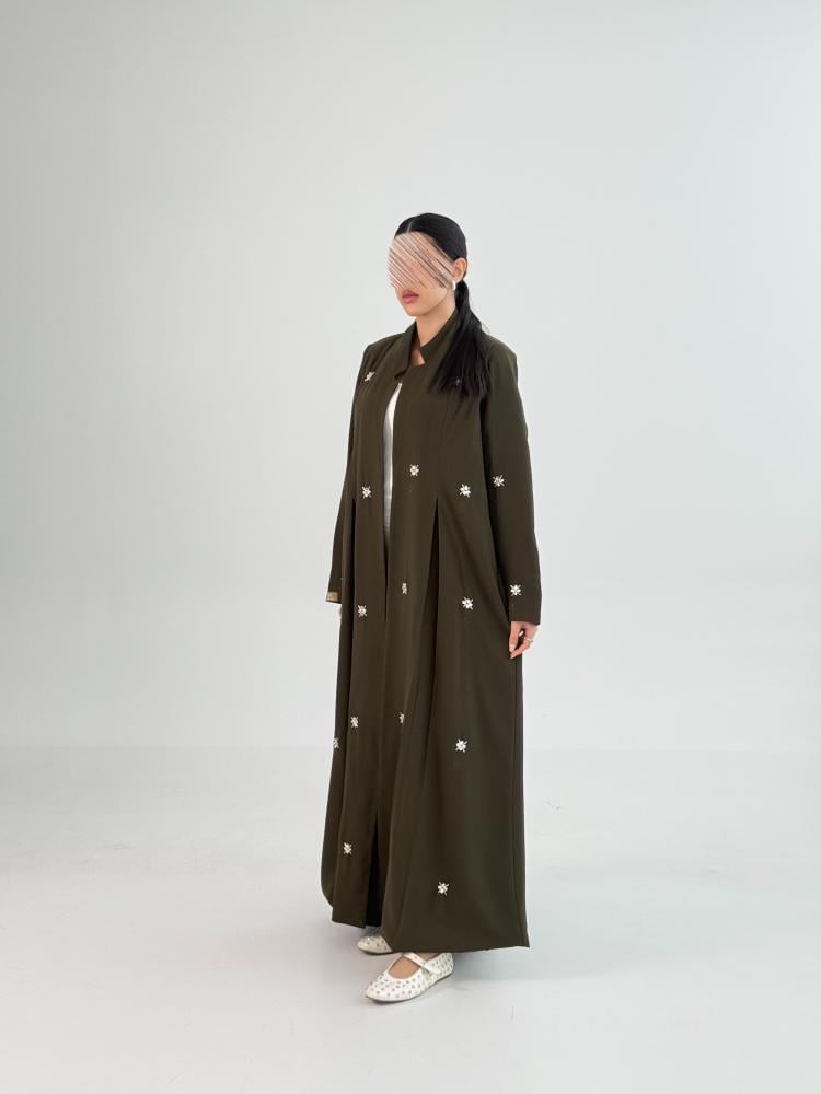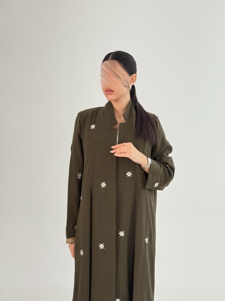 عباية سوار بليزر رسمي مزين بكسرات وشك بقماش كريب رموش زيتوني