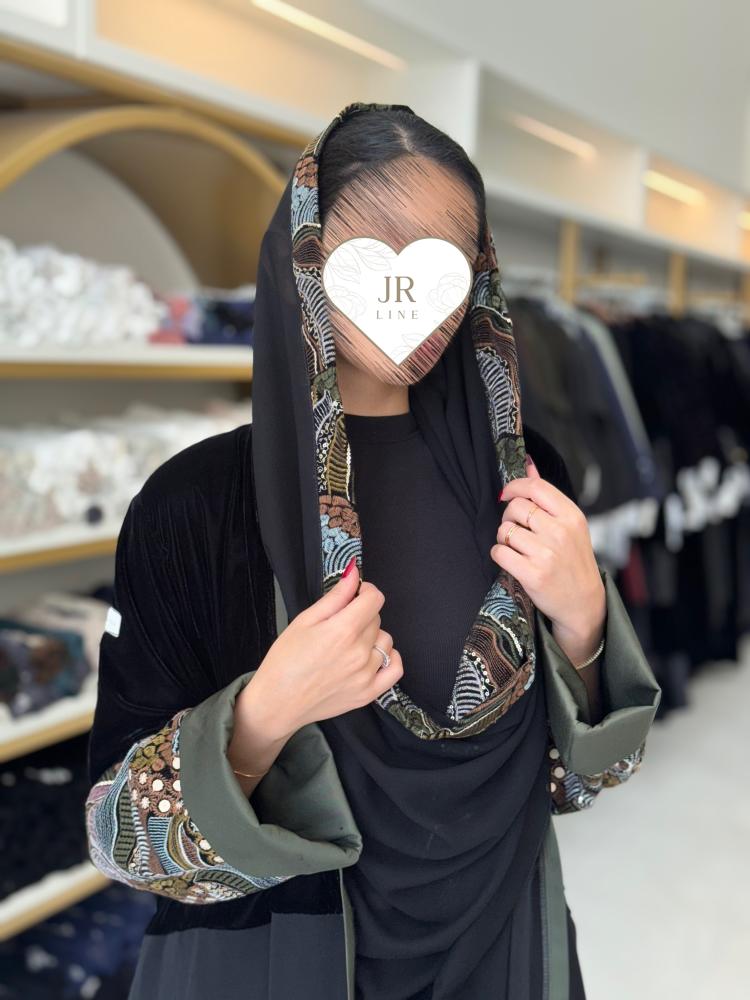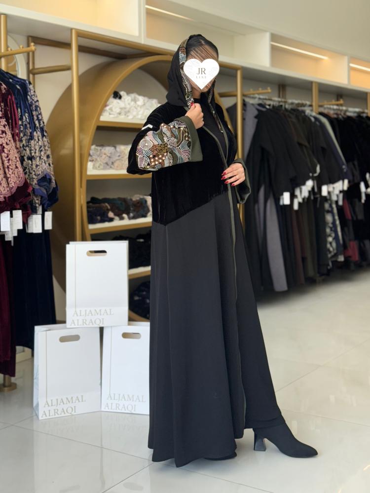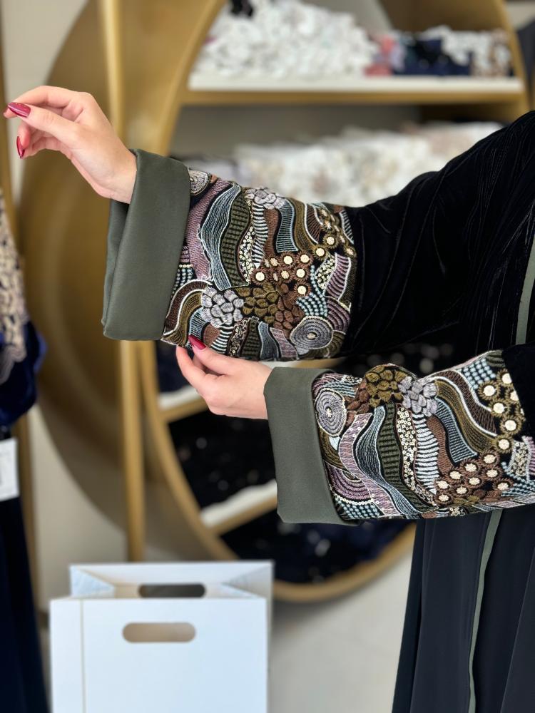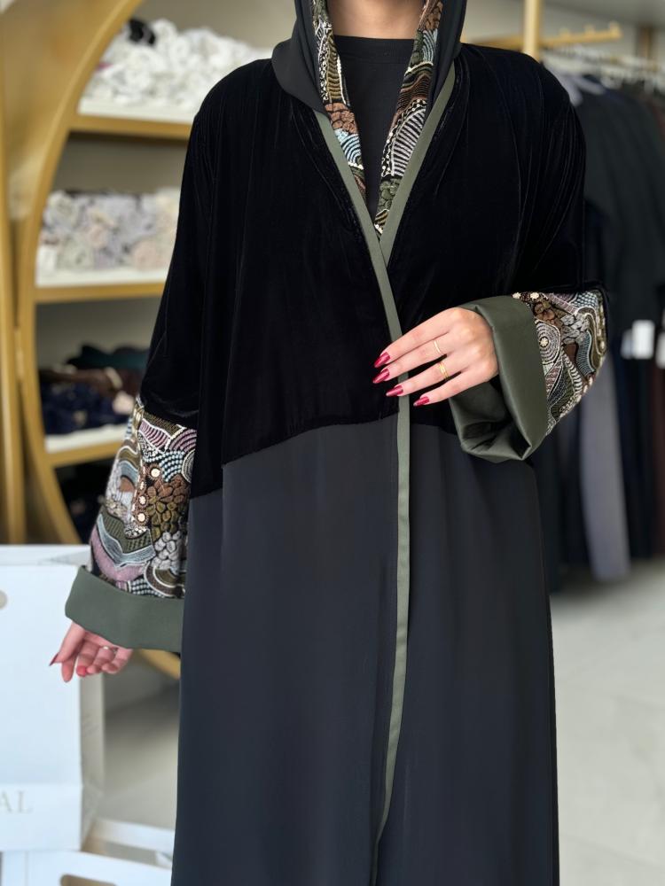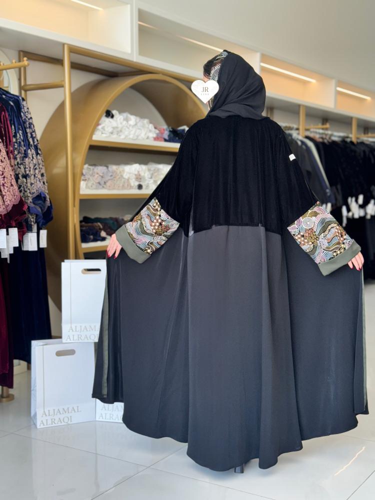 عباية غداف بقماش مخمل كوري تدخيلات كريب بلاك كم مطرز اخضر 2