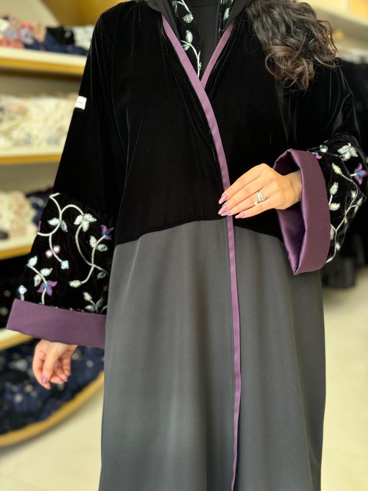 عباية غداف بقماش مخمل كوري تدخيلات كريب بلاك كم مطرز موف
