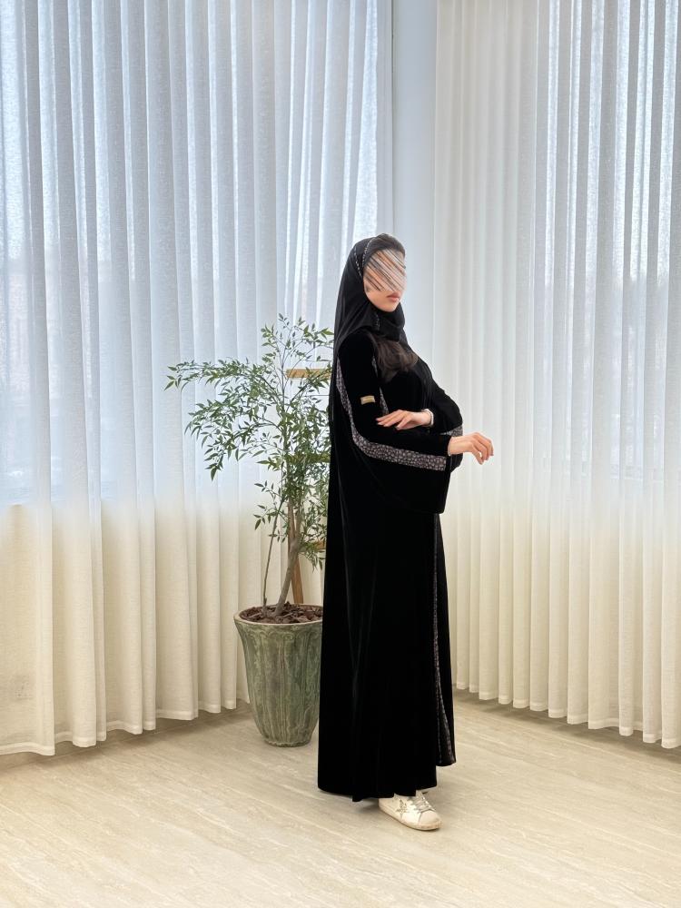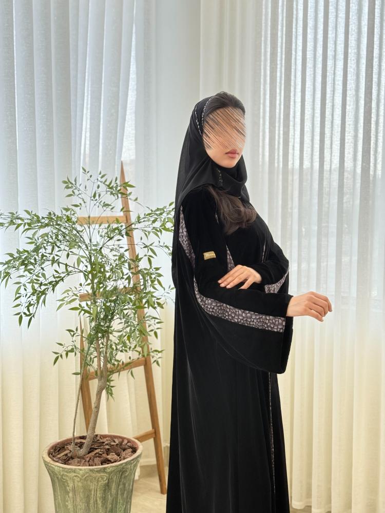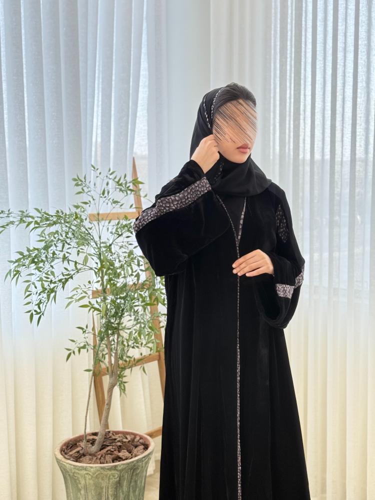 عباية فيحاء بقماش مخمل كوري تدخيلات كشميري رمادي