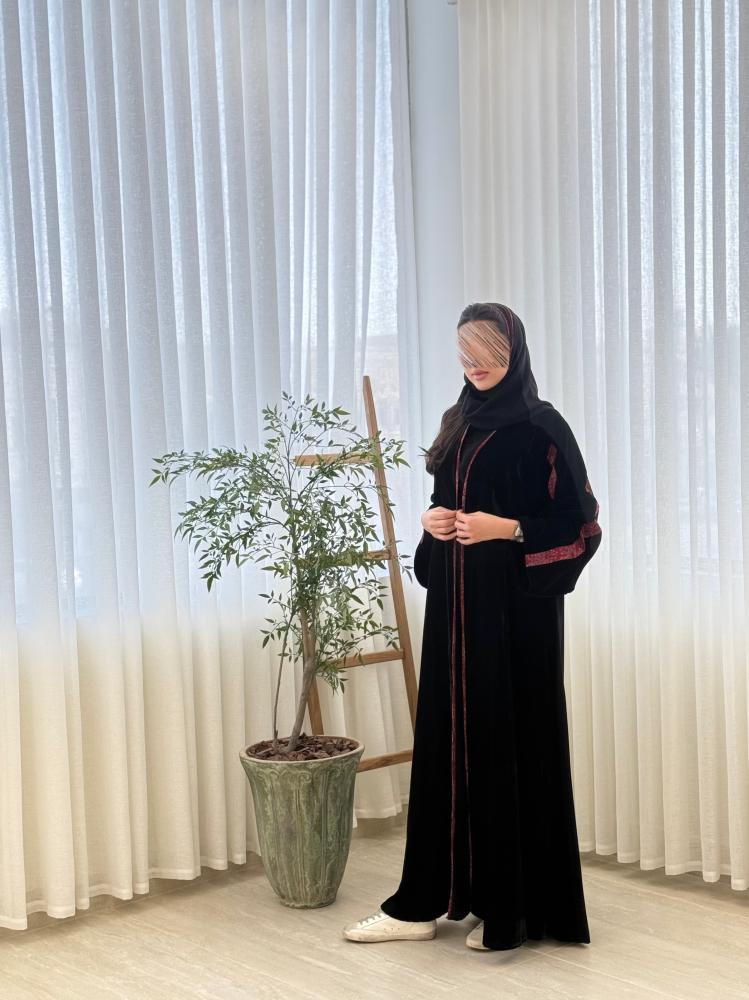 عباية فيحاء بقماش مخمل كوري تدخيلات كشميري عنابي