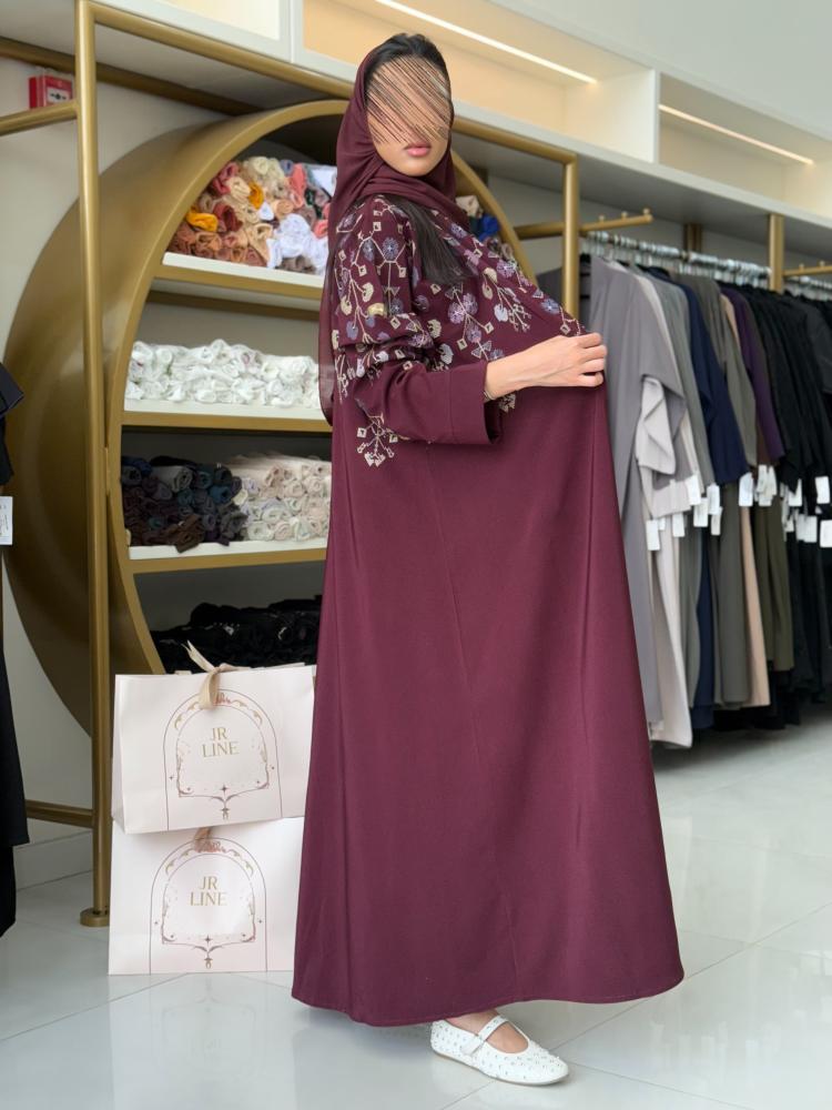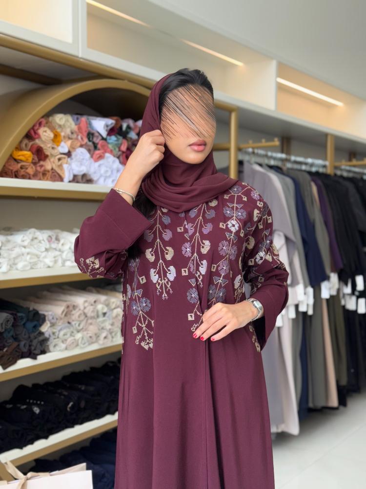 عباية ميرال بقماش كريب اوكراني مطرز عنابي غامق
