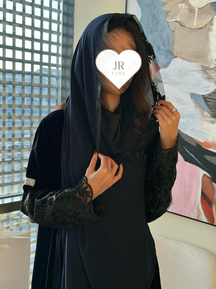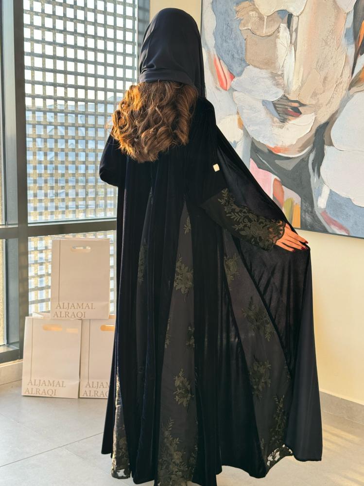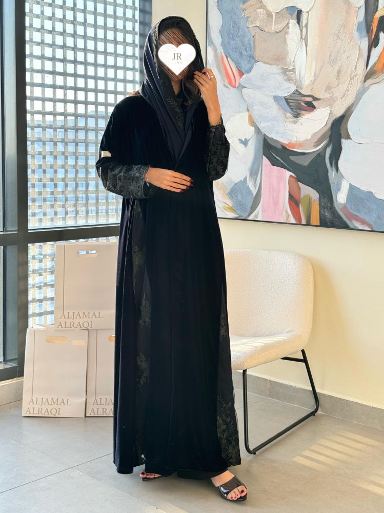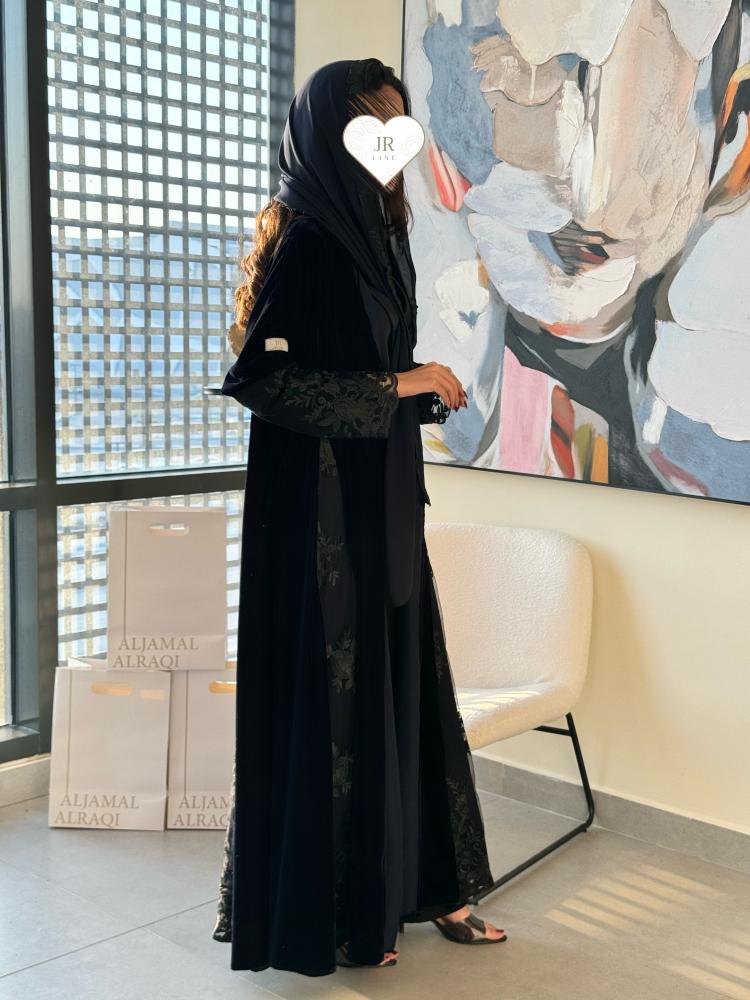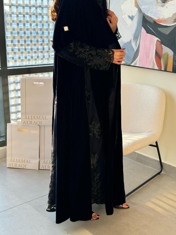 تشكيلة شتاء 2024 - عباية غادين بقماش مخمل دانتيل اسود - كحلي
